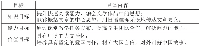 课程思政教学是一种体系。[4] 所谓人才培养的目标体系,是要将人才培养目标具体化、层次化,在一定教育理念的指引下,将宏观的人才培养目标细化、分解,最终形成一个包含道德素养、人文精神、知识结构、专业能力等元素构成的完整目标体系。因此,确立人才培养目标的准确定位,形成完整的培养体系,是高校形成人才培养模式和方案的前提和关键。在课堂思政建设以前,对人才的培养要求是“知识、能力和素质协调发展,富有创新精神,具有扎实的日语基本功和专业能力,熟练的日语听说读写译技能与良好的交流与沟通技巧,拥有较强的思辨能力与创新能力”。诚然,这是由于社会对日语专业人才的需求所限,随着新时代发展要求,日语专业人才培养要求也应该转变。在立德树人根本任务之下,要结合学校办学定位及人才培养方案的具体要求设置教学目标。作为培养应用型人才为主的高校,要坚持为服务地方经济做贡献,因此该课程秉持的教学理念是“学好外语,讲好中国故事,特别是徽州故事。”即如何“立德”,以及如何做好中国文化的传播者,对外讲好中国故事。因而课程目标设定要遵循以下原则,即课程章节目标是课程整体目标的细化和具体化,课程目标中认知目标与思政目标双线并重,具体从知识目标、能力目标、价值目标三个方面进行搭建。