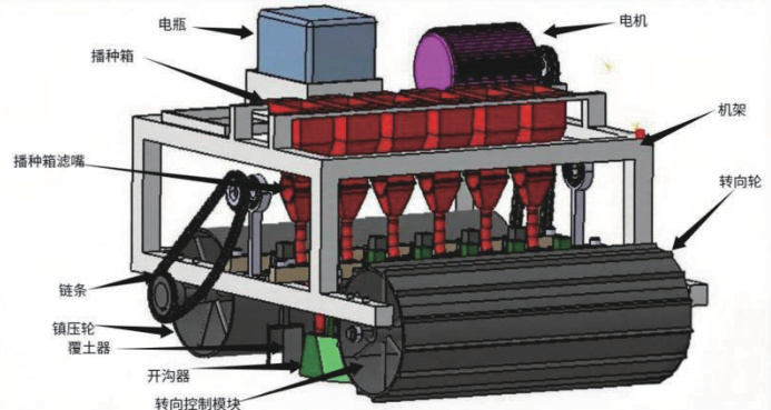 本文设计的播种自动装置可以在三电系统(电瓶、电机、电控)下,通过锂电池进行作物的播种,利用红外遥控控制转向及动力调速保证装置能够调整合适角度进行作业,与此同时接收端采用 4 路红外传感器矩阵布局,实现 360°信号覆盖,确保田地最大程度利用。用链条传动使速度与旋转轴成正比从而解决了了传统播种不均问题。而多排播种机构,使其率得到保障。