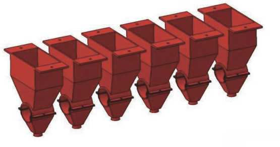 播种器采用多排播种机构 ( 如图 ),使其效率得到保障。每个播种箱下连接轴瓦,通过管 状结构直接输送到由开沟器开好的沟槽里,其侧端链接齿轮,通过链传动使镇压轮的旋转力传 递上来,使其可根据速度自适应播种器漏斗出种速率。