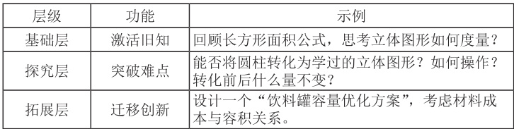 需要注意的是,学生认知水平呈现出循序渐进的特点。故而教师搭建问题链时要具有层次性。以“圆柱体积”为例,教师设计问题链,如表2 所示。