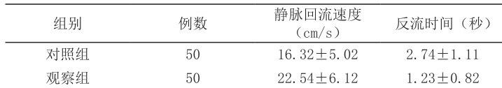 治疗后,观察组患者静脉回流速度明显提高,反流时间明显缩短,较对照组改善程度显著 (P⟨0.05) )。