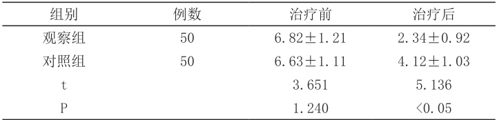 观察组在治疗后疼痛评分显著降低,VAS 评分较治疗前和对照组均有明显下降,差异具有统计学意义( (P⟨0.05) )。
