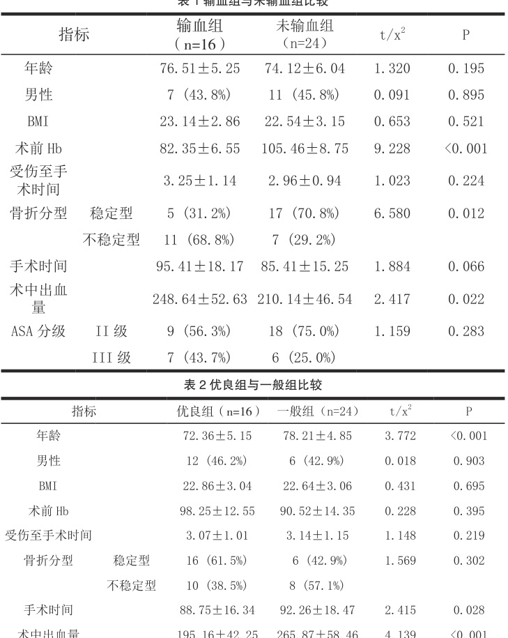 输血组术前 Hb 显著低于未输血组 (P⟨0.05) ),不稳定型骨折比例更高 (P⟨0.05) ;疗效一般组年龄更高 (P⟨0.05) )、术中出血量更大 (P<0.05) 。见表1、表2。