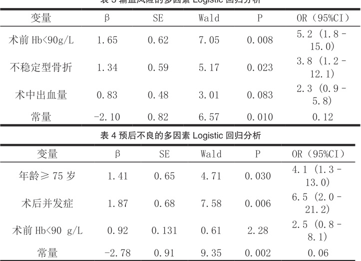 术中出血量为连续变量取原值。行多因素 Logistic 回归分析,结果显示术前 Hb ⋅<90g/ L、不稳定型骨折是输血独立风险因素;年龄≥75 岁、术后并发症是预后不良独立预测因子。见表3。