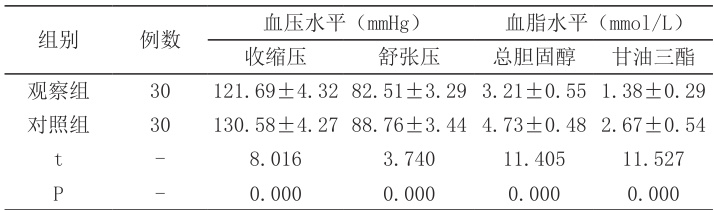 观察组的收缩压、舒张压、总胆固醇和甘油三酯水平均与对照组相比较低,P<0.05 。见表1。