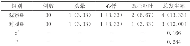 观察组发生不良反应的概率为 13.33% ,对照组的不良反应发生率为10.00% ,对比无统计学意义( ⋅P>0.05 )。见表2。