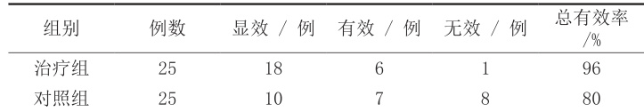 2.1 一般情况共入组哮喘患儿 50 例。观察组中有 25 例患儿,其中男 18 例,女 7 例,平均年龄(5.22±2.78)岁;对照组中也有 25 例患儿,其中男 16 例,女 9 例,平均年龄为(4.98±2.33)岁。