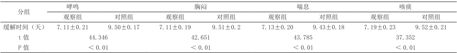 治疗后:对照组、观察组的总有效率差异均有统计学意义( .P<0.05) );观察组较对照组治疗后哮鸣、胸闷、喘息、咳痰消失时间明显缩短,差异有统计学意义( (P<0.01) 。见表1、2。