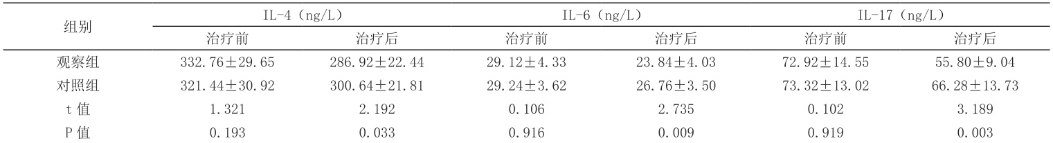 治疗前,观察组、对照组的 IL-4、IL-6、IL-17 水平较正常值相对偏高,比较差异无统计学意义( (P>0.05)c 。治疗后,两组 IL-4、IL-6、IL-17 水平均较治疗前有下降,观察组治疗后IL-4、IL-6、IL-17 水平下降值较对照组明显,差异有统计学意义( (P<0.05) 。见表3。