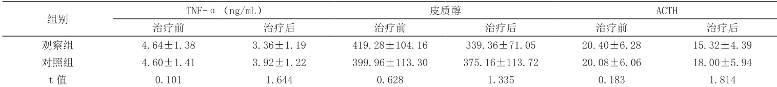 2.3.2皮质醇、ACTH、TNF-α 治疗前,观察组、对照组皮质醇、ACTH、TNF-α 水平比较差异无统计学意义( (P>0.05) ),治疗后,两组皮质醇、ACTH、TNF-α 水平均较治疗前下降,观察组治疗后皮质醇、ACTH、 TNF-a 水平下降差异无统计学意义 (P>0.05) 。见表4。