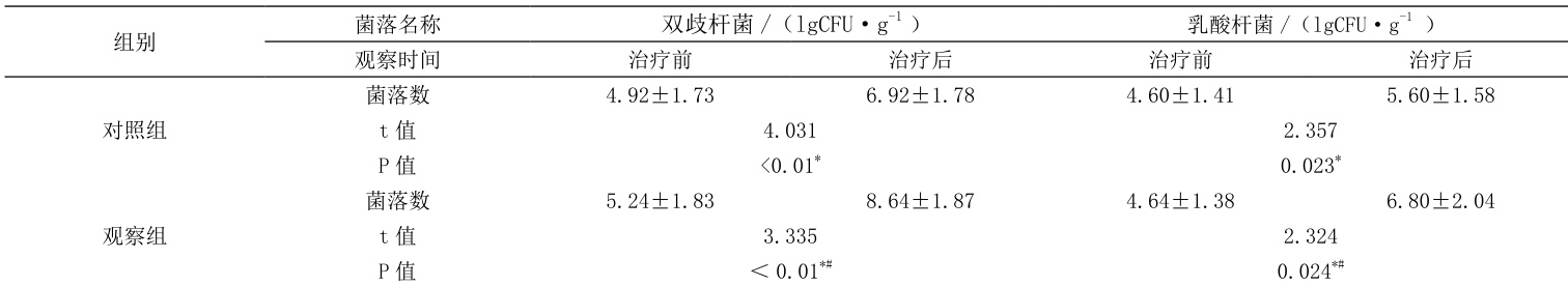 观察组、对照组治疗前大便中有益菌(双歧杆菌、乳酸杆菌)菌群落数水平差异无统计学意义( .P>0.05) )。两组治疗后 1 个月大便中有益菌(双歧杆菌、乳酸杆菌)菌群落数差异有统计学意义( (P<0.05) ;且观察组中有益菌(双歧杆菌、乳酸杆菌)菌群落数明显高于对照组,差异有统计学意义 (P<0.05) 。见表5。