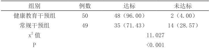 健康教育干预组血糖控制达标率显著高于常规干预组(P<0.05),见表1。