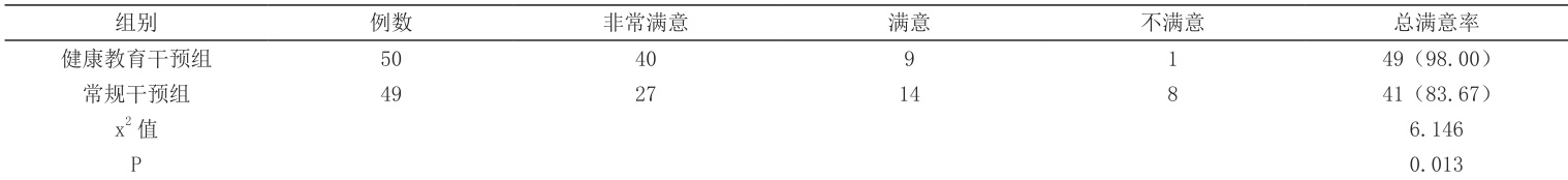 2.2 两组总满意率对比健康教育干预组总满意率显著高于常规干预组(P<0.05),见表2。