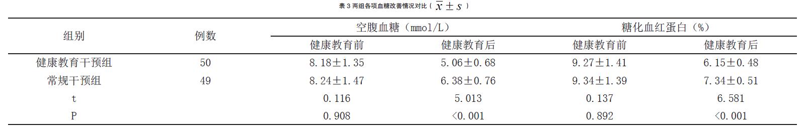 健康教育干预组血糖水平改善显著优于常规干预组(P<0.05),见表3。