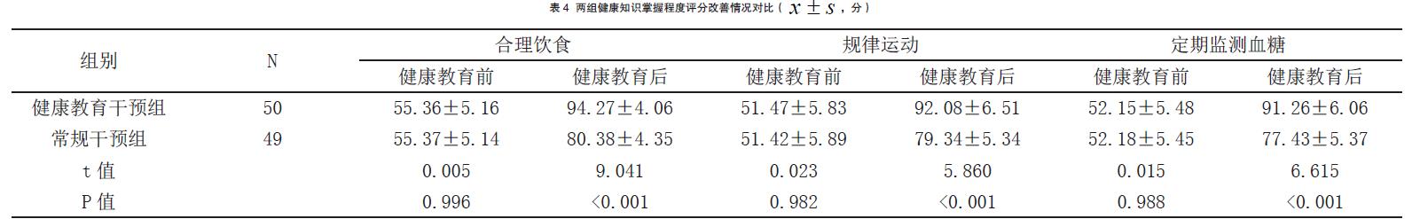 意 [4] ;(3)对于两组干预前后血糖水平;(4)对比两组干预前后健康知识掌握程度评分,采用自拟量表进行判定,主要从合理饮食、规律