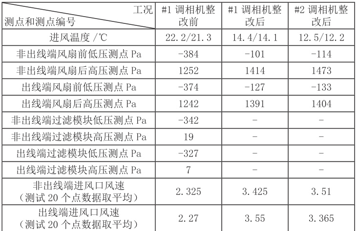 为了进一步论证漏油事件发生的原因,组织专业技术人员及专用设备开展调相机进风口和出风口压力相关测试工作。空气状态下,调相机 3000r/min 转速、大气压力 0.62bar 条件下进行,不同工况下各稳定运行 15 分钟,测量调相机风扇前后及过滤模块压力。调相机通风试验获得的原始试验数据见表1。
