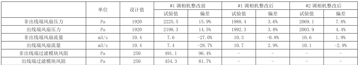 2)在对过滤模块进行改造后,再次进行了通风试验,发现调相机系统风阻得到了显著降低,风扇压力及风扇流量有明显改善。风扇工作点的压力较整改前,显著降低,与设计值接近;风扇流量较整改前,显著提升,与设计值相近。