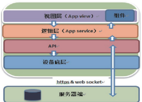 微信小程序分为视图层 (App view)、逻辑层 (App service)、AP1、组件、设备底层和服务器端。视图层主要用 WXML、WXSS 语言进行编写 , 展示页面结构、样式和数据。逻辑层用 is 进行编写 , 主要负责的是业务逻辑处理 , 并调用 API 接口等。API 提供了访问手机设备网络、服务器、微信平台等接口。组件是展示在视图层封装好的基础组件, 比如说输入框、按钮等, 如图2 所示: