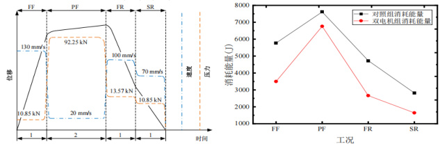图1 一个冲压循环工况下的工艺曲线图 图2 两组驱动系统节能效果对比图