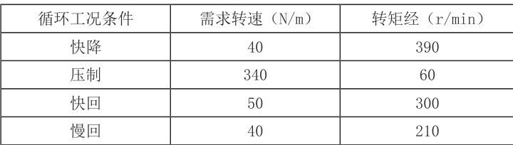 为了更好验证本次研究所提出的双电机耦合驱动系统能耗优化方案的实际节能效果,以具有代表性的机械压力机为例,开展冲压过程的能耗验证,并设置配套的冲压循环工况条件。具体如下:一是快降(FF),二是压制(PF),三是快回(FR),四是慢回(SR),此过程涉及的三个条件如下:一是位移情况,二是需求压力,三是需求速度[4]。由此得出图 1 所示的工艺曲线,及其每个阶段对应的两项输出参数,一是需求转速,二是转矩经(详见表1)