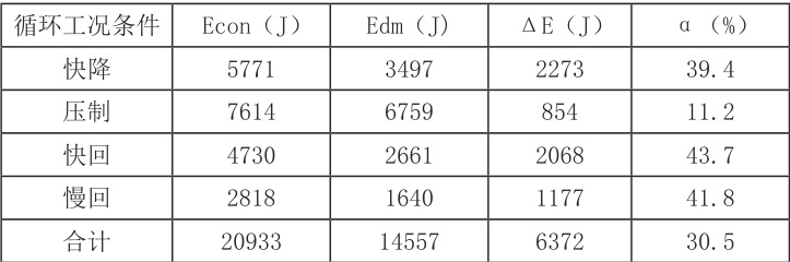当一个冲压循环工况运行结束后,两组驱动系统(本次研究中的优化后系统与单电机驱动系统)产生的能耗情况详见表 2,其中, Econ 代表对应工况下对比组系统能耗; Edm 代表本次研究优化方案应用后系统能耗;ΔE 代表系统节能情况;α 代表能耗提升比,也就是 Δ E 和 Econ 之间的比值。