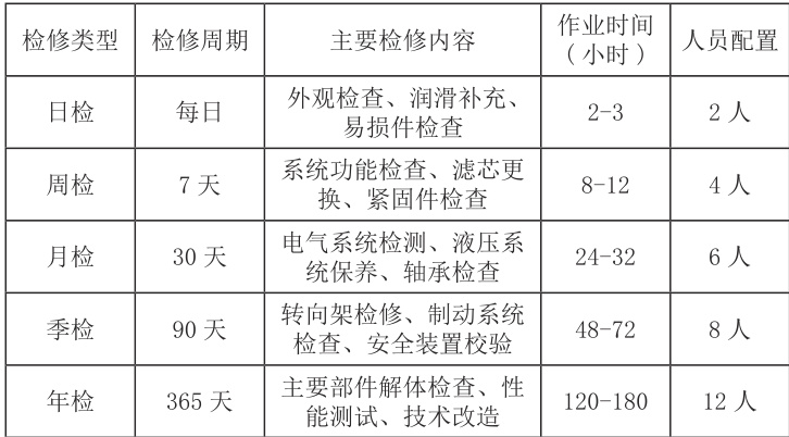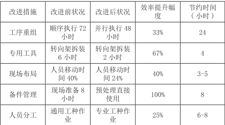 维修部门运用一系列的具体维修改进措施,使维修作业从根本上脱离了传统的方式和方法,实现了效率的明显提升 [4]。(1)对维修工序重新进行调整是提高维修效率的重要手段,即在维修人员开展维修时,由传统的一套维修工序按顺序进行的维修方式转变为两套或多套维修工序并行进行的维修方式,即在传统维修方法基础上,把钢轨打磨车季度维修工作细化为机械系统维修、液压系统维修、电气系统维修 3 个独立子任务,分配 3 个维修小组分别同时进行维修作业,3 个工作小组运用维修节点、时间节点的划分,明确了各项作业的有序对接不出现冲突的情况,同时维修人员运用细化维修的工序安排,设置了工序间缓冲环节,在关键维修节点上,运用临时维修作业区域设置方式,保障了上一维修环节完成后,在下一维修环节有缓冲场地,没有等待现象,避免了无效等待的时间浪费现象。(2)专用工具的开发和应用极大地改变了传统的拆装方式,维修人员针对转向架吊装作业的特点,设计制作了可调节高度的专用吊装架,该吊装架配备了精密的定位装置和安全锁定机构,操作时只需要一名维修人员控制电动葫芦即可完成转向架的精确定位和安装,整个作业过程无需反复调整位置,维修人员还开发了液压管路快速连接工具,该工具采用自锁式接头设计,配合专用的扳手可以实现管路的快速拆装,每个接头的拆装时间从原来的 15 分钟缩短到 3 分钟,大幅提高了液压系统维修的作业速度。(3)现场作业布局的系统性改进也发挥了关键作用,维修人员运用绘制详细的作业流程图和人员移动路径图,重新设计了检修现场的功能分区,把工具存放区、零部件临时存放区、清洗区、装配区按照作业流程顺序进行排列,每个功能区之间的距离控制在 5 米以内,同时在各区域之间设置了专用的推车通道,配备了可移动的工具车和零部件运输车,维修人员在作业过程中可以推着工具车在各区域间移动,避免了来回搬运工具和零件的重复劳动。(4)备件管理方式改善直接缩短了维修作业等待时间,维修人员形成了“一车一箱”的备件配送模式,即为每一台工程车准备一个专用备件箱,箱内分别按检修项目的顺序分类放置各类常用易损件,每次检修作业前把备件箱送至作业现场,维修人员就近取件,检修完成后把剩余备件及箱子一同回库。此外,还设置备件预处理工作区,主要针对一些即将使用的备件提前进行清洗、涂抹胶水、预装配等准备工作,现场进行安装即可使用,不用再进行其他准备工作。(5)人员配置和技能分工精细化成为效率保障,维修部门由原来通用性维修工改为专业化维修工,每位维修工负责 1~2 个专业系统维修作业,运用专业化分工使得维修人员熟悉掌握自己所负责专业系统的结构、故障特点以及维修要领,能迅速、准确完成各项作业,同时还建立了跨专业协作制度,当某个专业完成维修作业的进度提前时,支援其他专业维修作业,保证整个维修进度(见表2)。