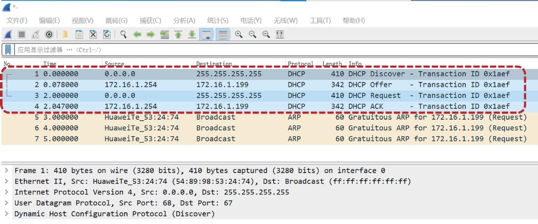 2. 理论精讲(20 分钟)。关键知识点:DHCP 报文交互流程(结合Wireshark 抓包演示),见图 1 所示。