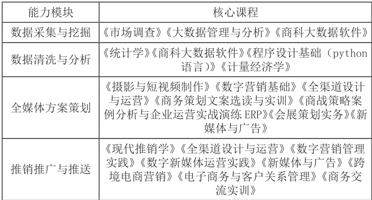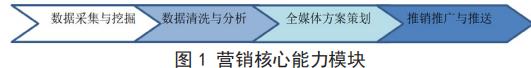 经过前行业调研和同行调研,地方应用型高校数字营销专业毕业学生应具备数据采集与挖掘、数据清洗与分析、全媒体方案策划和推销推广与推送能力(见图1 营销核心能力模块)。