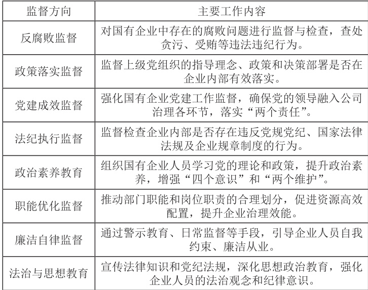 国企纪检监督工作是为企业员工和企业发展而制定的举措,主要是为了加强对国企员工责任和权力的监管,并加强国企党风廉政建设,促进企业的健康、和谐发展。从纪检机构监管工作的内涵出发,其价值在于能够对国企的良性运行、清除企业“蛀虫”、警示相关单位做好本职工作,并促进企业实现战略发展目标起到积极的作用。始终把企业发展放在党的正确指导下,不断地开拓改革的道路,为国企发展和竞争汇聚更强大的内在力量。国有企业纪检监督工作方向与主要工作内容如表1 所示。