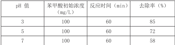 化学处理工艺是通过化学反应,使污染物物理和化学性质发生变化。高级氧化技术(AOPs)被认为是处理难以降解的有机物的高效方法,特别是芬顿氧化技术,它通过亚铁离子与过氧化氢的化学反应生成羟基自由基,从而能够氧化多种难以降解的有机物。不同pH 条件下,芬顿氧化对苯甲酸的去除率不同(见表 2)。