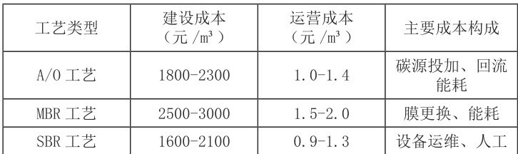 传统活性污泥法初期投资最低,但运营阶段污泥处置成本较高;MBR 虽建设成本高,但因占地少、出水水质优,在再生水回用项目中全生命周期成本更低。
