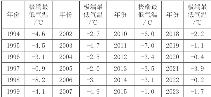 表1 1994 年-2023 年乡宁县3 月下旬到5 月上旬极端最低气温