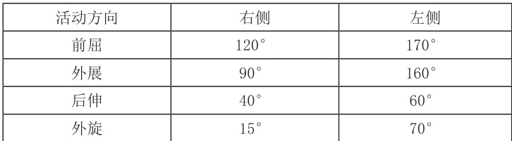 活动受限:肩关节各方向活动均受限,外旋障碍最明显,主动、被动活动均困难且伴僵硬感,日常穿脱衣物、梳头等需健侧手辅助。