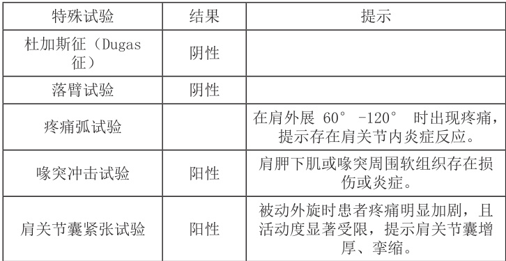 撞击综合征:阴性诱发试验(Neer/Hawkins)→可排除神经/ 关节炎:无神经根症状 + 无全身炎症表现→不支持