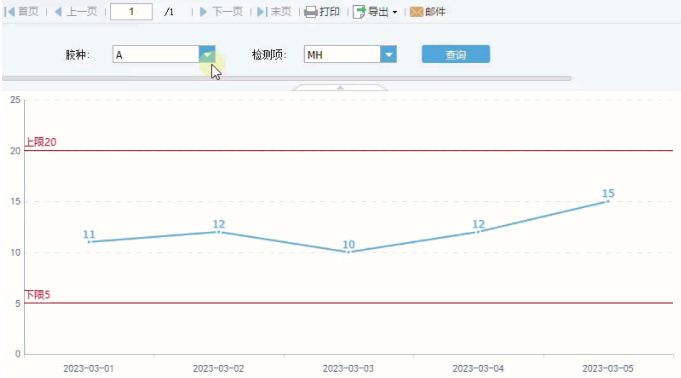 利用平台从零开发的某企业的“实时动态警戒线”系统,可以实现全胶种、全检测项、全自动、实时警戒线查询、趋势展示,投入 0.5 人月即完成开发上线工作,其中,低代码开发平台学习0.2 人月,SQL 语言学习0.2人月,MES 快检系统相关数据报表逻辑学习与最终报表开发,0.1 人月,共投入 0.5 人月,界面效果如图 1 所示,根据选择胶种、检测项不同,警戒线自动匹配展示。