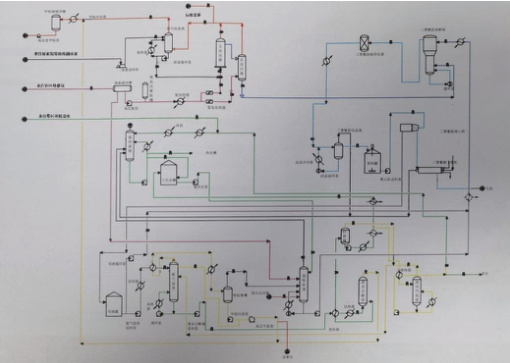 闪蒸后的气相与工艺水汽提塔顶部物料半路结合,进入氨汽提塔。底部液相加热溶解水并预热氨汽提塔进料的母液后,分成两股:一股作为循环水储存在循环水箱,一股被加热后送到工艺水汽提塔。