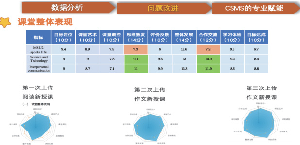通过三次课例的对比分析,CSMS 系统的数据清晰地展现了教学改进的成效。学生的课堂参与度显著提升,师生互动更加频繁且有效,思维能力和语言应用能力也得到了明显发展。此外,学生在广东省中小学英语听说能力展示活动及学校英语书写竞赛中均取得了优异成绩,进一步验证了教学改进的效果。