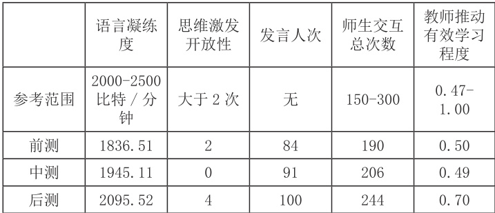 通过数据反馈,可借助视频复盘功能,分析学生的课堂回答情况与学习反应,进一步优化提问内容,设计层层推进的问题链,有针对性地调整课堂教学策略,进行第三次授讲。后测的数据能客观反馈调整后的教学行为是否能提高课堂学习效果。对于同一课例,每次的测评结果都能客观地认识自身优势(如表 1),及时发现自身问题,保持做得好的方面,调整尚有不足的地方,从而提升教师课堂教学能力。