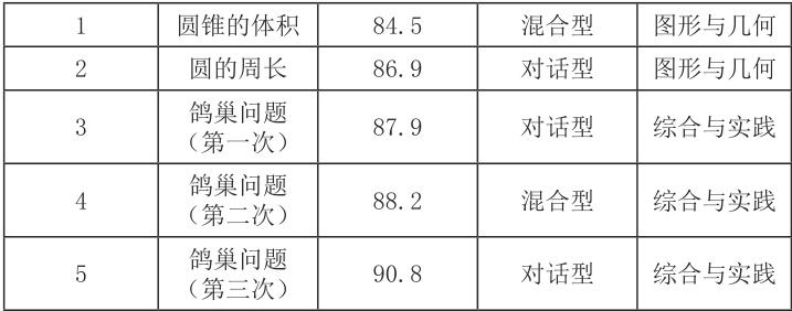 小学数学课堂教学内容的类型不同,为了教师全方位了解自己的课堂教学综合能力,在运用 CSMS 进行诊断时,可以开展多种教学内容的课例研究,综合评判教师教学中的优势与短板。笔者在平台里共上传五个课例,其中《圆的周长》一课是在查看了《圆锥的体积》的 CSMS 报告和视频复盘,优化调整问题链后上的一节课例。从数据可看出(如表 2),笔者的课堂教学能力在不断提升,能有效地运用知行理论开展课堂教学,培养学生的学科素养和数学能力。