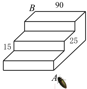 如图5,是一个三级台阶,它的每一级的长、 Z 、高分别等于 90cm,25cm 和 15cm,A 和 B 是这个台阶的两个相对的端点,A 点上有一只昆虫,想到 B 点去吃可口的食物 . 请你想一想,这只昆虫从 A 点出发,沿着台阶面爬到B 点,最短线路是多少cm ?