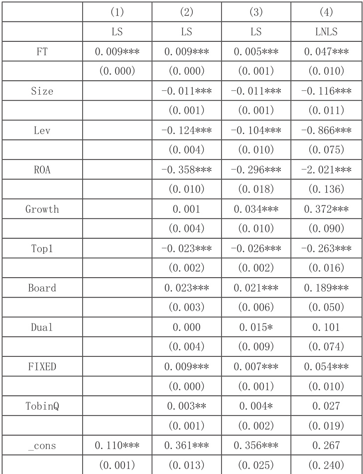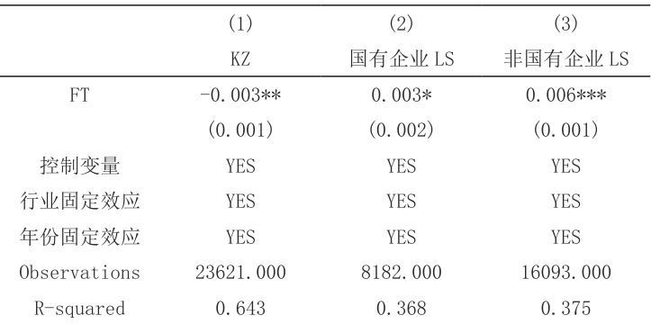 表 1 第(1)、(2)和(3)列汇报了金融科技发展水平对劳动收入份额的影响。列(1)为不加入控制变量且未控制行业和年份效应的结果,FT 的系数为0.009,在1% 的水平上正向显著。列(2)为加入控制变量但未控制行业和年份效应的结果,FT 的系数为0.009,在1%的水平上正向显著。列(3)为加入控制变量且控制行业和年份效应的结果,FT 的系数为 0.005,在 1% 的水平上正向显著。综述所述,假说H1 成立,即金融科技促进劳动收入份额的增加。