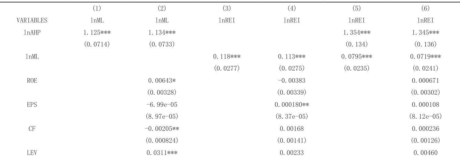 这其中, LnREIi,t 表示某上市公司在年内的房地产投资金额,以公司报表中的投资性房地产科目来衡量,以此来衡量该企业的在房地产领域的投资, RDi,t 表示某上市公司 在Ψt 年内的研发投入,以此来衡量该企业的在创新领域的投资, LnAHPi,t 表示某上市公司在年内所在省份的房价水平,以此来衡量放假对该企业的投资行为的影响, lnMLi,t 衡量某上市公司在年内抵押贷款总金额占所有贷款金额的比重,以此来衡量抵押贷款对于上市公司信贷的重要程度, 来表示所有的控制变量。本文同时控制了行业层面、年度层面的固定效应。