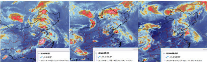 图 6 FY2G 卫星云图 2021 年 7 月 13 日 03 时、14 日 00 时、14 日 11 时