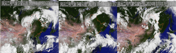 图 7 FY2G 卫星云图 2024 年 7 月 16 日 01 时、17 日 00 时、17 日 15 时
