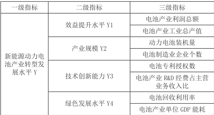 基于福建省新能源电池产业发展现状,本研究从效益提升水平、产业规模、技术创新能力及绿色发展水平四个维度构建评价指标体系,以全面反映产业转型的关键特征与发展潜力。