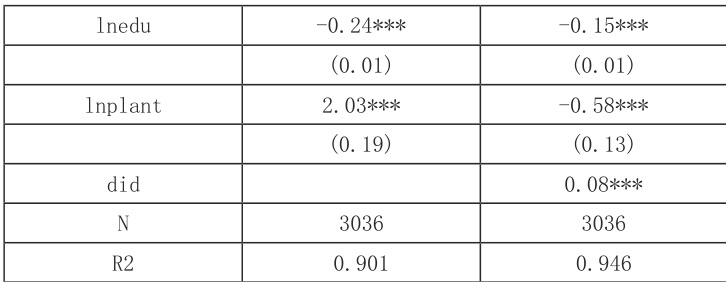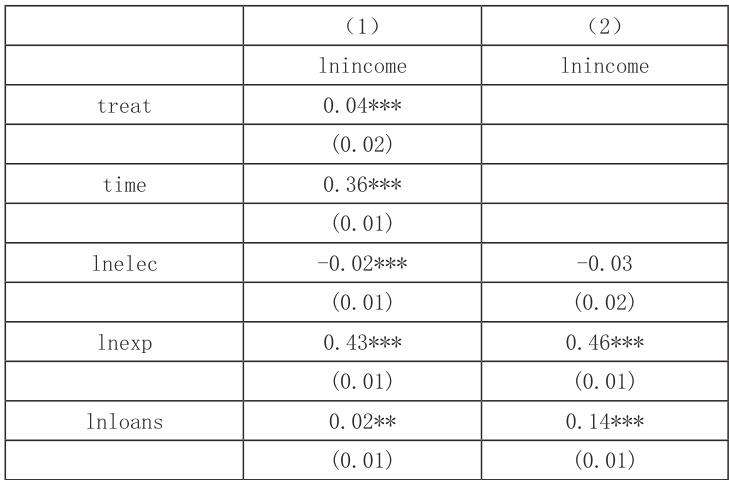 列(1)显示,虚拟变量 treat 和 time 的回归系数在 1% 的水平下显著为正,说明农地试点政策分别从时间和地区来看能够提高农民可支配收入。列(2)显示,交互性 did 的回归系数在 1% 的水平下显著为正,综合来看,农地试点政策能够提高农村居民人均可支配收入。