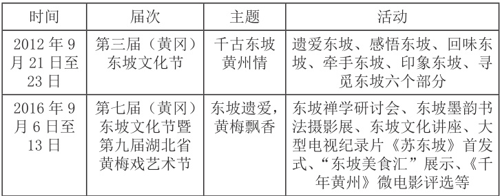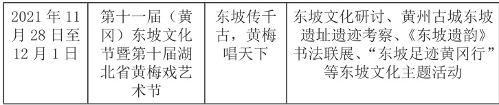 比如,在 2016 年的第七届东坡文化节上,活动内容包括东坡禅学研讨会、东坡墨韵书法摄影展、东坡文化讲座、大型电视纪录片《苏东坡》首映式、“东坡美食汇”展览、《千年黄州》微电影评选等,全方位展现了苏东坡在文学、艺术、生活等领域的影响力。在 2021年第十一届东坡文化节期间,更推出了东坡文化研讨会、黄州古城内的东坡旧址考察、《东坡遗韵》书法作品联展,以及“东坡足迹黄冈行”等多个以东坡文化为主题的活动,逐步打造出具备地方特色的文化旅游品牌。