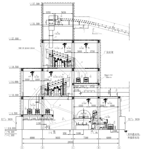 某矿山项目成品筛分车间,长 48m ,宽 28.5m ,总高 37.9m ,其中混凝土主框架高 27m ,主结构三层,并设有两个皮带机夹层,混凝土框架顶部局部设双层钢框架,用于接驳中细碎车间来料胶带机。成品筛分车间共设有8 台圆振动筛,按两层 4+4 设置,设备型号为YJK3675。下层振动筛设置于 10.000m 高程楼面,上层振动筛设置于 18.500m 高程楼面。A 轴柱尺寸为 600mm600mm ,其余柱均为 800mmx800mm. 。设有振动筛区域,柱网尺寸为 9mx7.5m ,横向框架主梁尺寸为 300mmx750mm 和 300mmx1000mm ,纵向框架主梁尺寸为 500mm1200mm ,振动筛下的次梁尺寸为 500mm1150mm ,楼板厚度 200mm ;两侧副跨尺寸分别为 7.5m 7.5m 和 6.0m 7.5m ,横向主梁尺寸为 300mmx750mm ,纵向主梁尺寸为300mmx750mm ,次梁尺寸为 250mmx700mm ,次梁布置间距为 2.5m ,楼板厚度120mm⨀ 。从厂家提供的设备订货资料可知,筛分设备的振动频率约为 15HZ