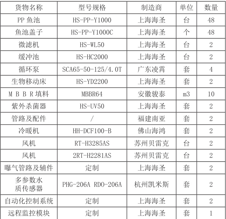 整个养殖循环系统通过物理过滤、生化处理、灭菌调温、智能回流闭环设计,结合三级控制,在有效净化水质的同时,实现了养殖水的循环利用以及温度精准调控。表 1 展示了本项目养殖循环系统采用的设备以及型号等信息。