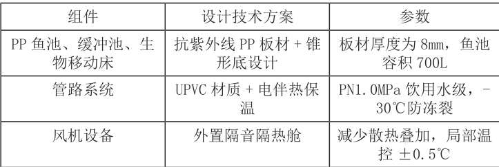 在本项目中,为适应新疆极端温差气候环境,PP 鱼池、缓冲池、生物移动床等均采用了抗紫外线PP 板材,在极端温差环境下,材料能够有效地抵御热胀冷缩带来的影响,避免接口出现开裂问题。为有效解决新疆冬季极端低温带来的负面影响,在系统的一些关键部位,比如冷暖机设备的配套管理均进行了电伴热保温设计,防止因为极端低温导致管路开裂。在风机外部,设置了隔音隔热舱,可以避免散热集中区域对局部温控带来负面影响。表2 展示了气候适应性设计技术方案与相关材料参数信息。